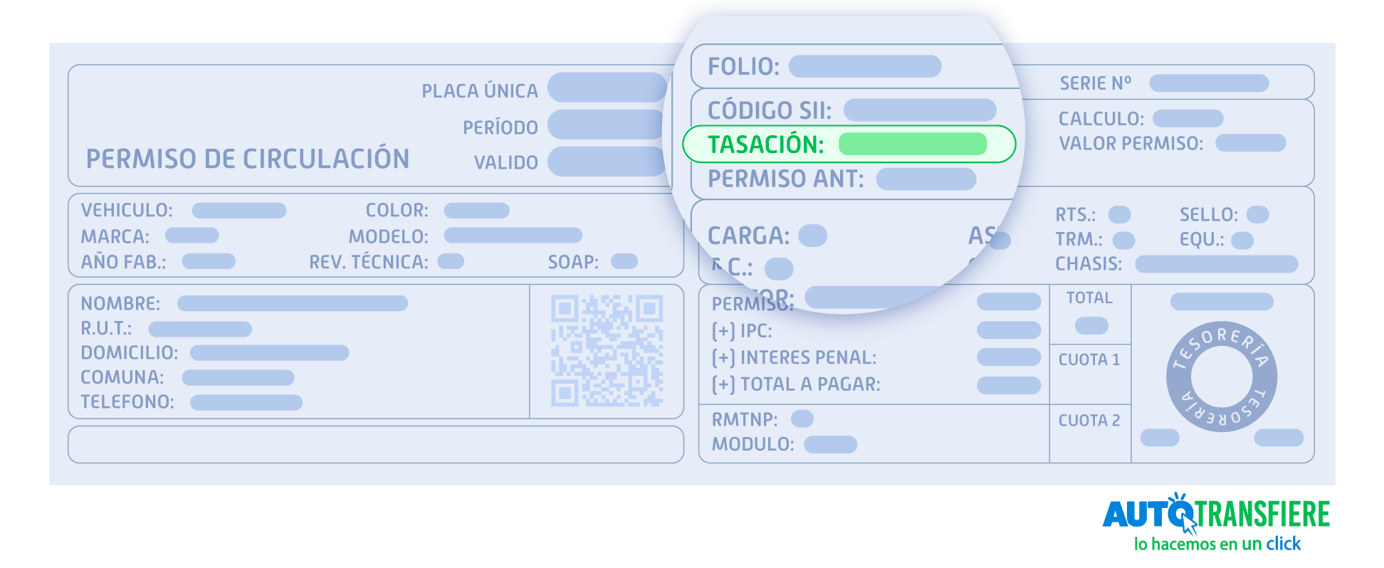 Encuentra la tasación actual en el permiso de circulación si este se encuentra al día, de lo contrario debes realizar busqueda en Sii. La ubicación puede variar dependiendo la comuna en la que se emitió el permiso.